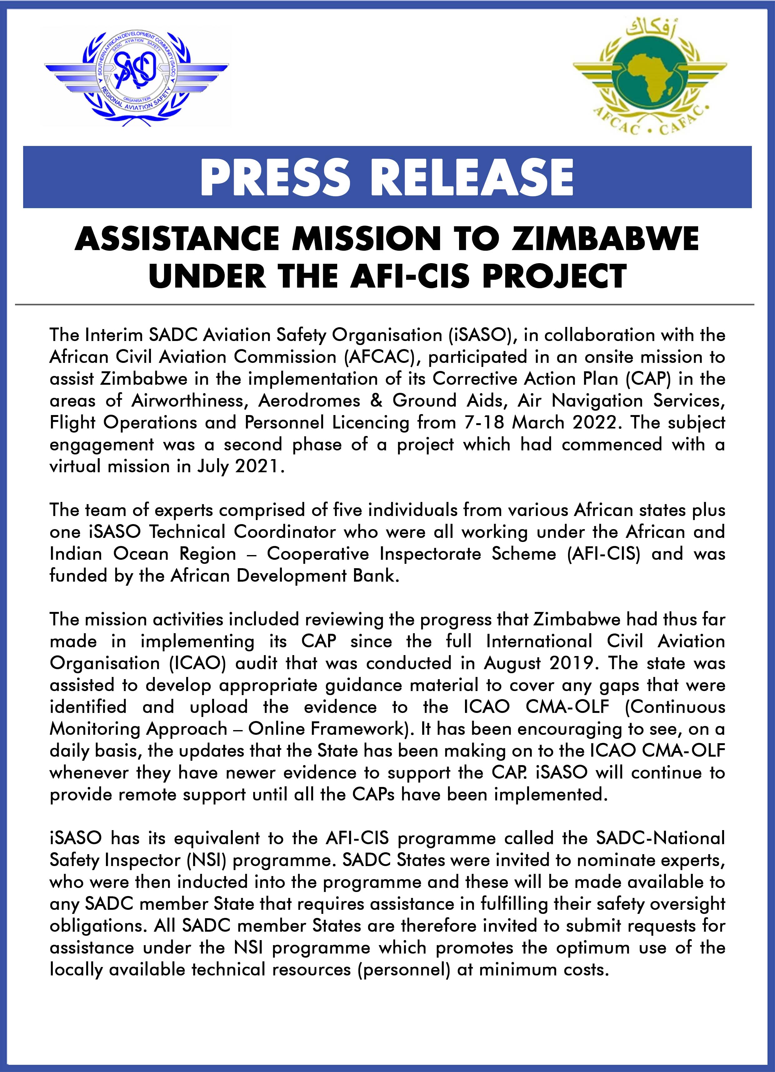Assistance Mission to Zimbabwe Under the AFI-CIS Project